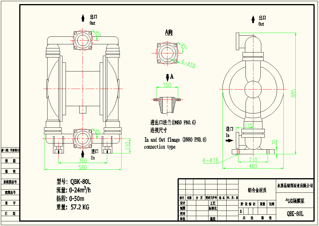 QBK-80L鋁合金氣動隔膜泵,泵體采用優(yōu)質(zhì)鑄鐵材質(zhì),配丁腈橡膠隔膜片,適用于污水,油類等無強腐蝕類介質(zhì)的輸送。流量0-24m3/h,揚程0-50m,口徑DN80,法蘭連接。